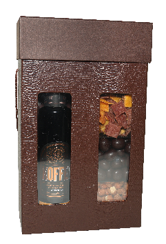 A Classic Textured Wine Box Filled With An Acrylic Container Of Chocolates, Nuts, And Dried Fruit. Packaged With A Coffee Liquor, Artisan Popcorn And Chocolate Crepes, This Ensemble Is The Perfect Choice For Friends Or Corporate Clients.